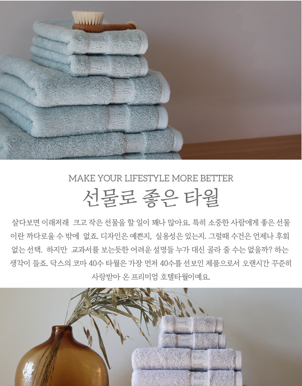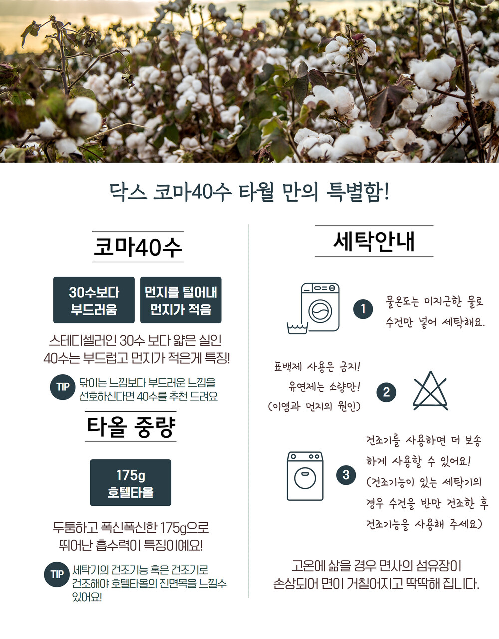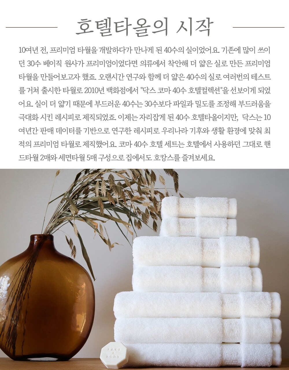 오랜시간 연구와 함께 더 얇은 40수의 실로 여러번의 테스트를 거쳐 출시한 타월로 2011년 백화점에서 "닥스 코마 40수 호텔컬렉션"을 선보이게 되었어요. 실이 더 얇기 때문에 부드러운 40수는 30수보다 파일과 밀도를 조정해 부드러움을 극대화 시킨 레시피로 제직되었죠. 이제는 자리잡게 된 40수 호텔타올이지만, 닥스는 10여년간 판매 데이터를 기반으로 연구한 레시피로 우리나라 기후와 생활 환경에 맞춰 최적의 프리미엄 타월로 제직했어요.